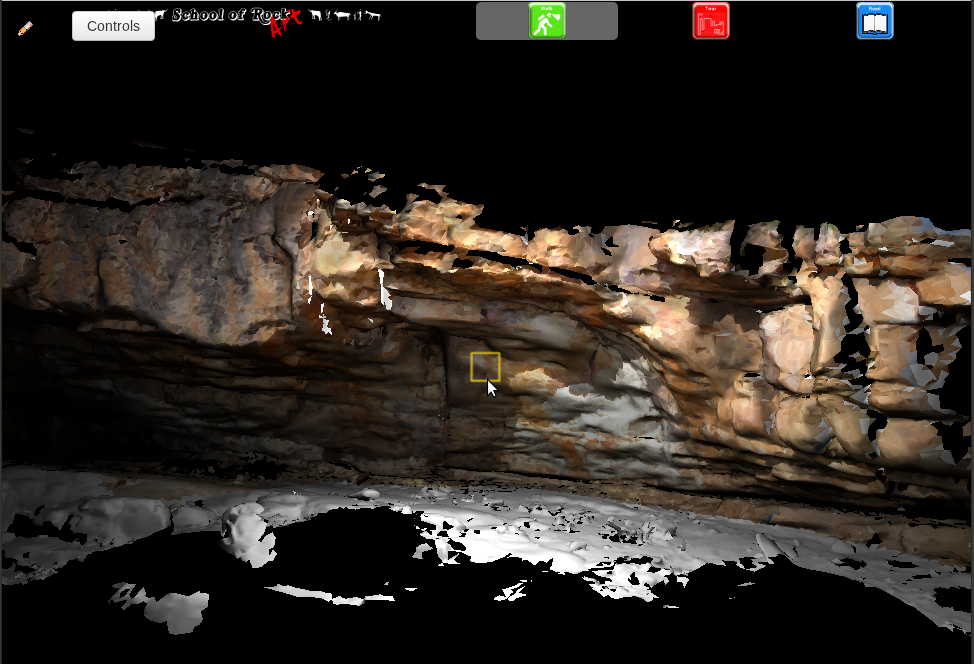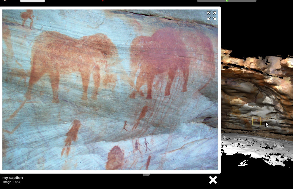 Selecting an item of rock art in the cave calls up an interface that allows the user to see and scroll through photographs of the piece of art in question. The photographs are accompanied by information pertaining to the artwork. This interface is implemented as a semi-transparent overlay on top of the cave and allows the user to view the images without losing sight of the area of the caves that they are actually painted in. The users can therefore see the art without losing the context that it comes from.