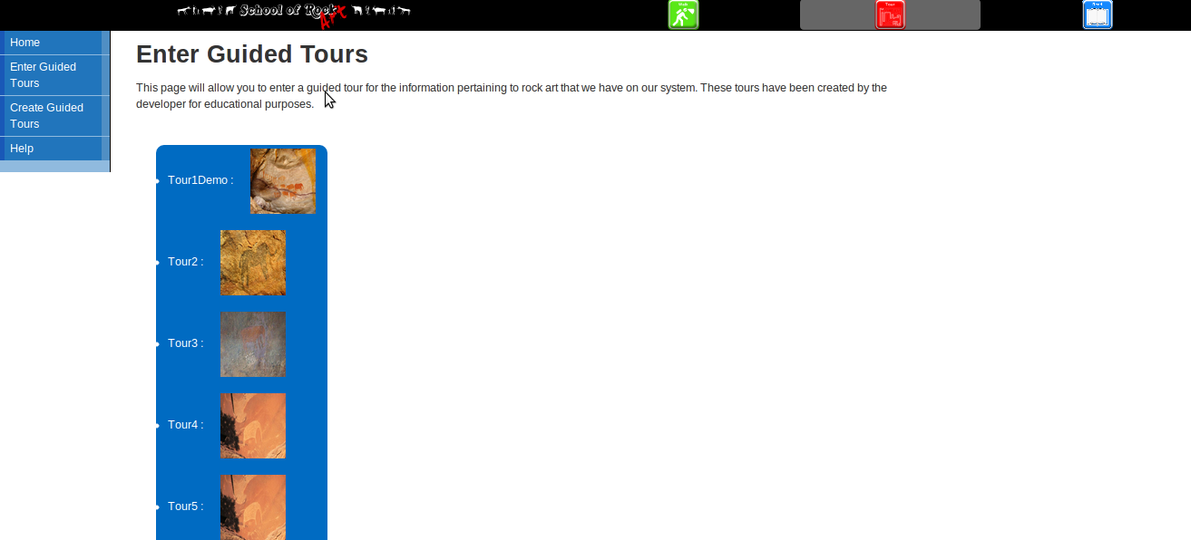 The user will be provided with a list of tours that exist on the server. Once a user finds the appropriate tour, the user may click on the link and begin the tour. Each tour is accompanied by a thumbnail providing the user with an idea of the images the tour includes.
