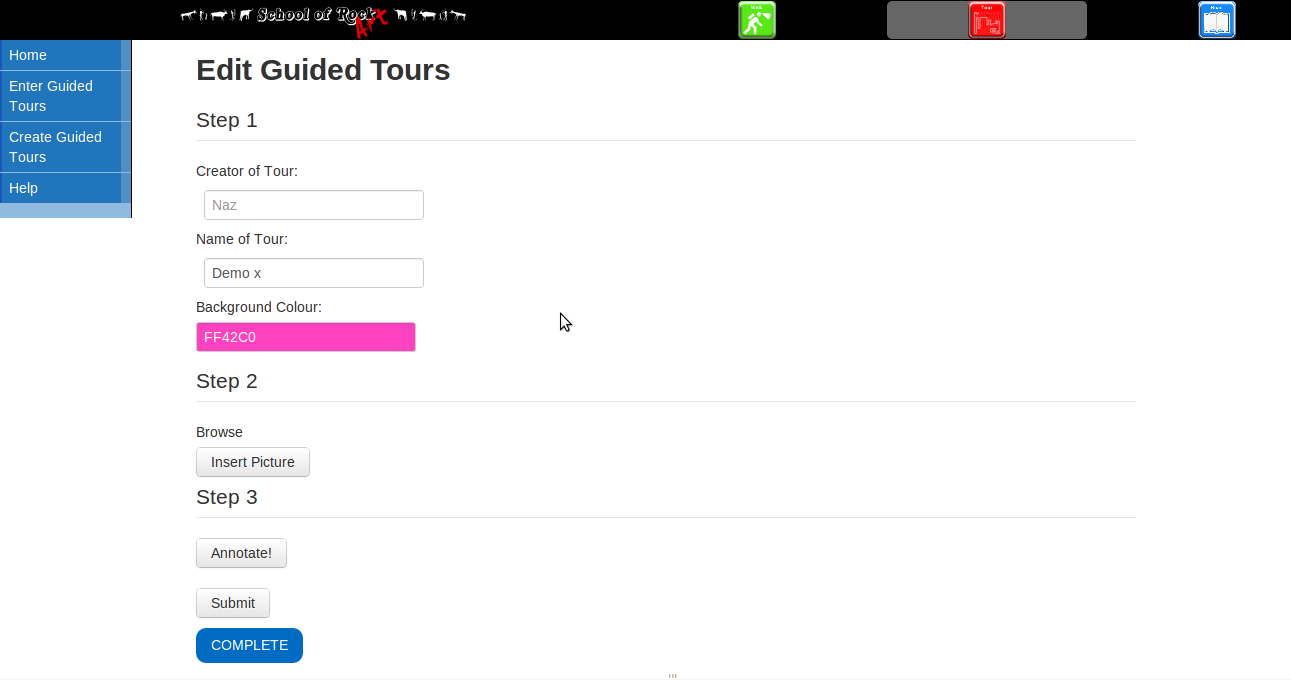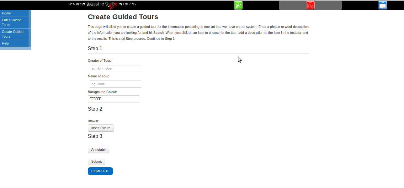 Users will be allowed to create a guided path using the website. The creation form will allow the user to name the tour and change the background colour of the tour to give it a unique look. Images will be chosen based on the appropriate keywords the user chooses. The user will be allowed to then describe the images before submitting the form.