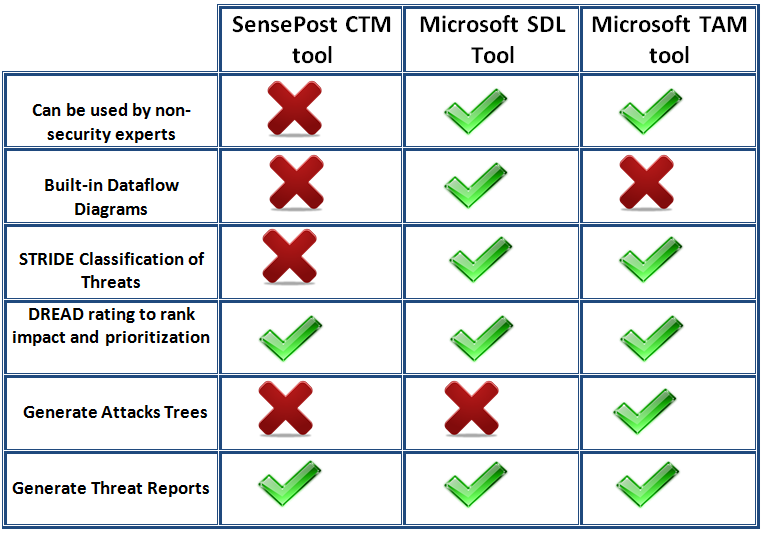 The Microsoft TAM, Microsoft SDL and SensePost CTM were compared qualitatively, each with its own disadvantages and advantages. The SensePost CTM was more suitable for security experts as it did not generate any threats but you would have to define your own threats. The focs of the SensePost CTM was on providing decision making information. The Microsoft SDL model was more suitable for software–centric modeling approach than attack centric as it was designed for threat modeling before and during the application development. The Microsoft Threat and Analysis Modeling (TAM) tool proved to be very useful in generating automatic use-cases and threats according to components specified. The tool is designed so that even non-security experts are able to model application security. Unlike the Microsoft SDL and SensePost CTM, The Microsoft TAM generates attack trees and mitigation strategies for certain vulnerabilities found.