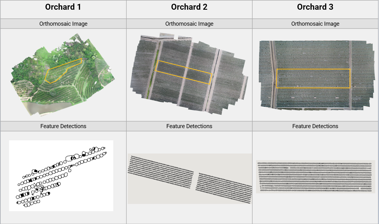 The input data used in this project was provided by Aerobotics. It consists of the polygonal tree instance detections for three seperate orchards. Each detection has an associated confidence level indicating the probability that it's a true detection of a real tree. The data provided has been pre-registered by Aerobotic's current human-based method and thus has to be misregistered during the evaluation process.