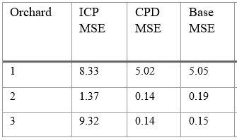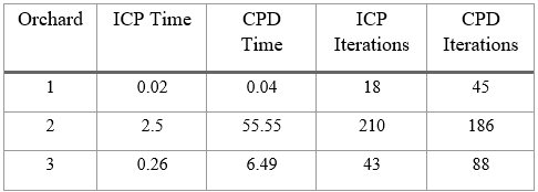 The above figures show the visual registration results of ICP and CPD on each orchard, with the same rigid deformation being applied to all three. CPD is seen to produce visually accurate results.