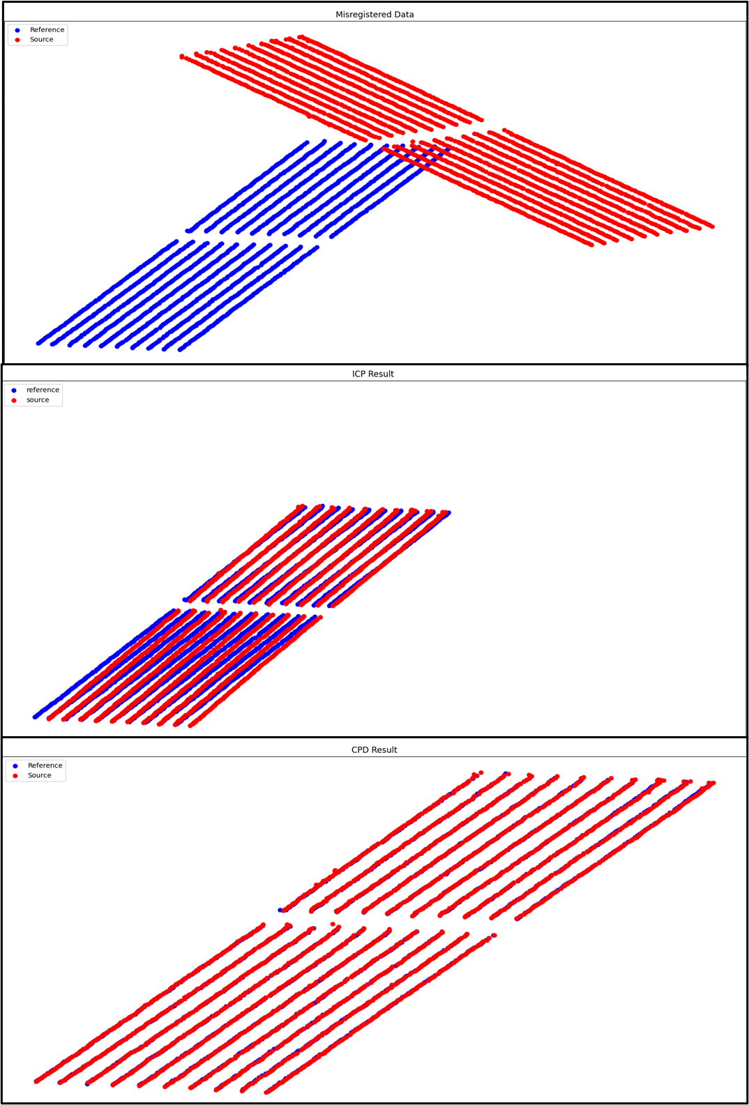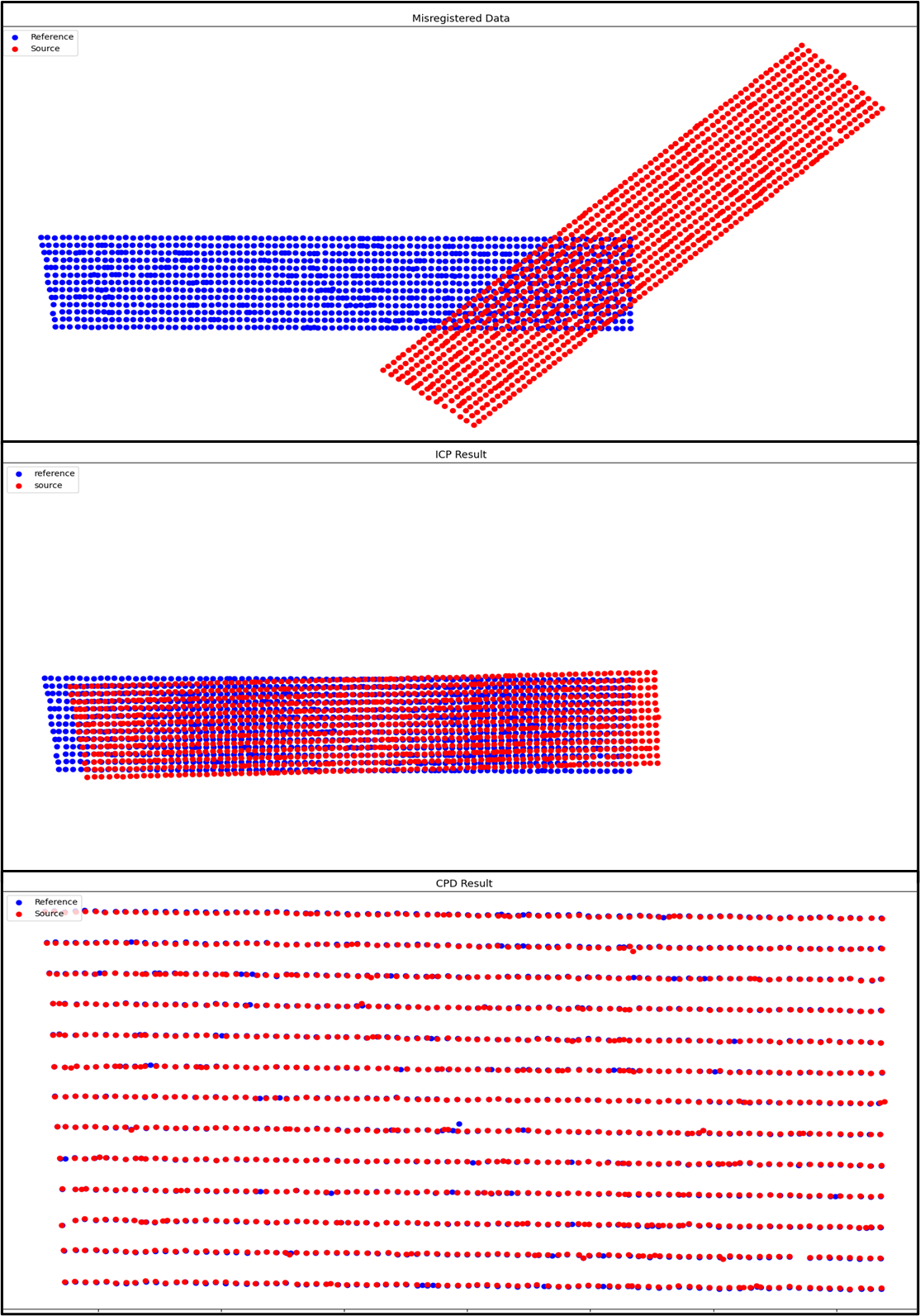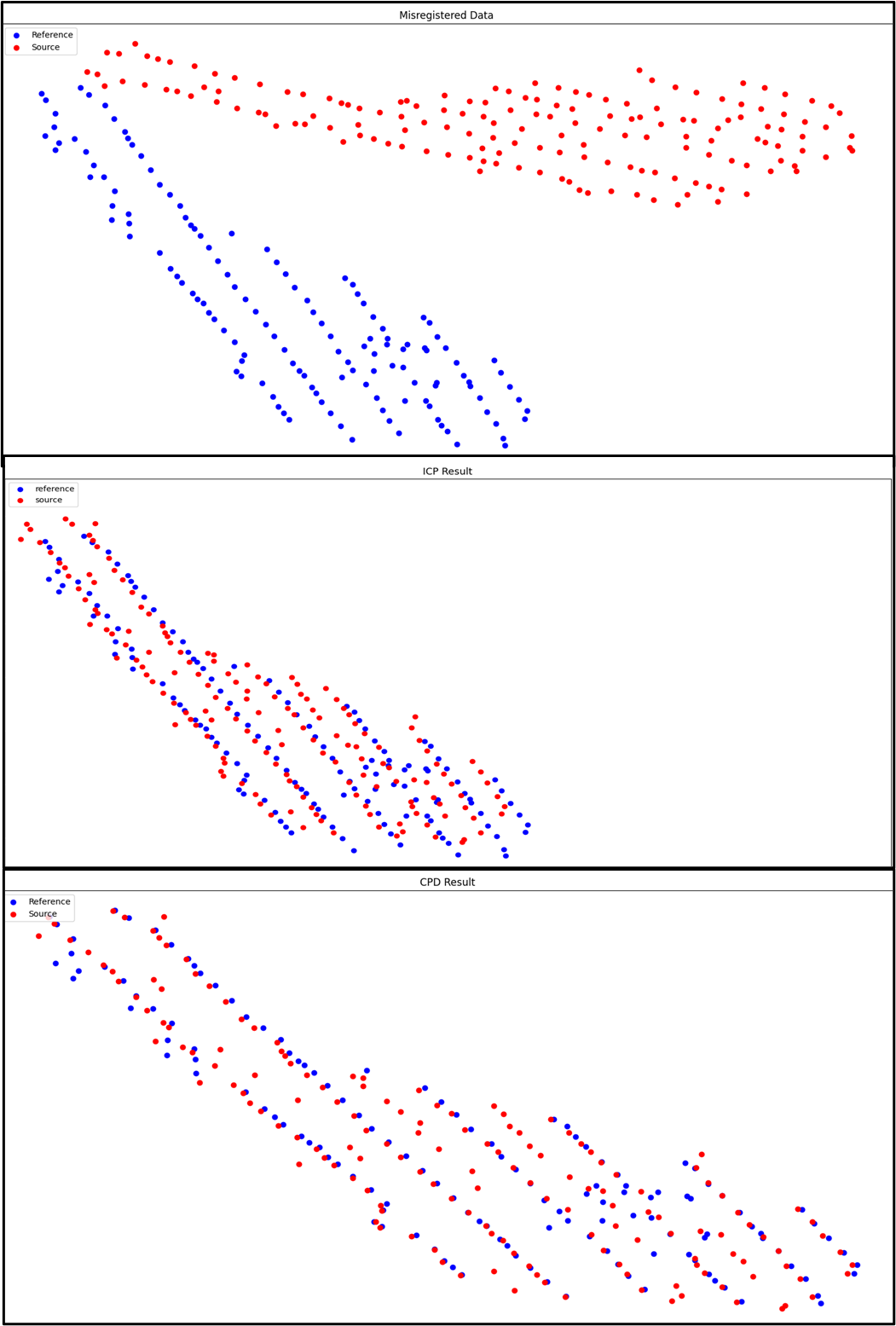 The above figures show the visual results of one of the most important robustness tests on the data, the test of each algorithms robustness to noise and additional outliers. As seen, CPD provides a visually accurate registration despite the added noise.