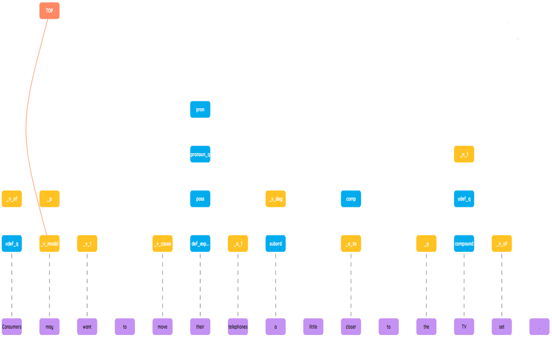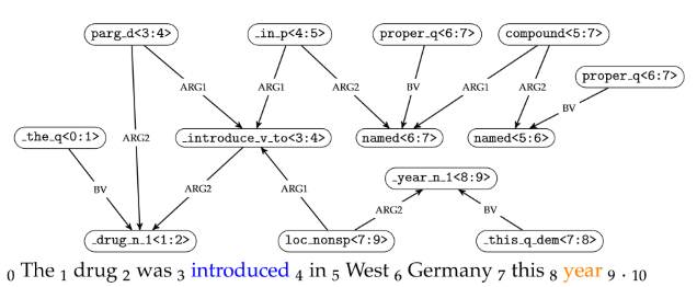 A number of frameworks exist which provide rules for the parsing process, such as Dependency-based Minimal Recursion Semantics, Elementary Dependency Structures (the choice for this project), Prague Semantic Dependencies, Universal Conceptual Cognitive Annotation and Abstract Meaning Representations. See image for example on an EDS graph.