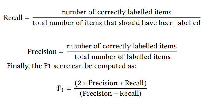 For our experiments, the micro-averaged precision, recall and F1 score was used to calculate the node label accuracy. The gold (i.e. target) spans are extracted from the data. In this context, a labelled item consists of a node label and span information. For both gold and predicted spans, any unlabelled token is removed from the set before the aforementioned metrics are calculated.