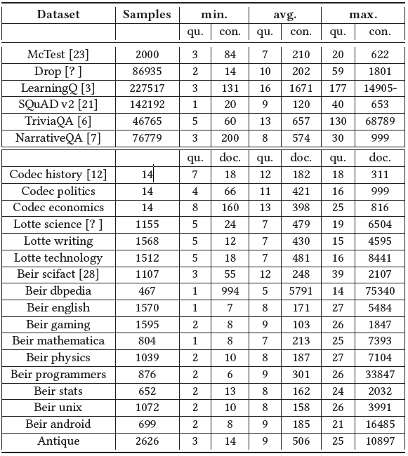 Reading-comp is a large dataset containing five reading comprehension datasets (sometimes known as question answering datasets), and contains 354k samples. Except for one dataset, NarrativeQA the other four are shallow datasets (i.e. the answers are directly in the text), however, in this research we simply use the questions and contexts from each dataset. Both t5-base and docT5query models that were trained LearningQ were further training on this dataset.