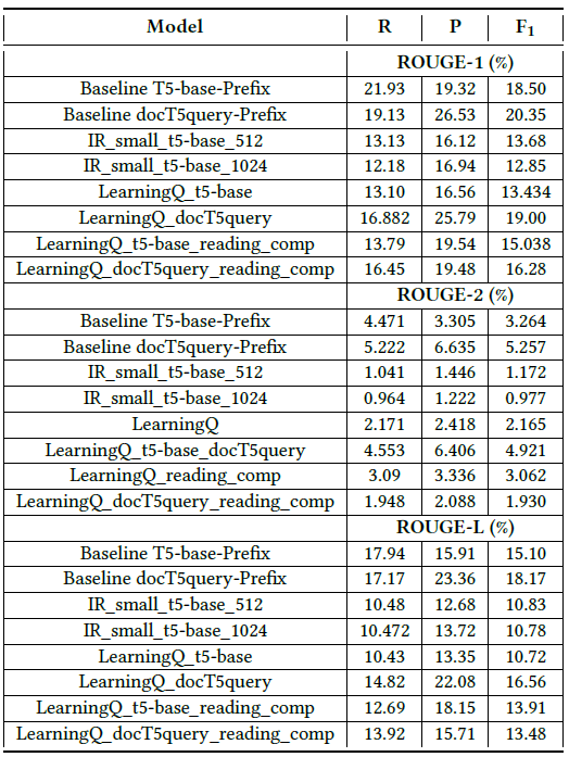 LearningQ is a large dataset of student questions and long passages of text from learning platforms, and contains 227k samples. This dataset closely resembles the small lecture-transcript and questions dataset in that the questions contained within this dataset were created by students and instructors from online learning material. Both t5-base and docT5query were trained on this dataset.