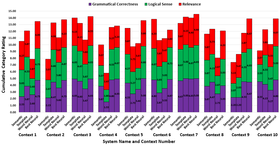 The systems were compared in terms of Question Quality through an online survey. This involved presenting 15 participants with 10 contexts and questions generated by the systems from these contexts. The particpants scored the questions from 1-5 in terms of Grammatical Correctness, Logical Sense and Relevance. Coverage over the dataset was also accessed through internal evaluation.