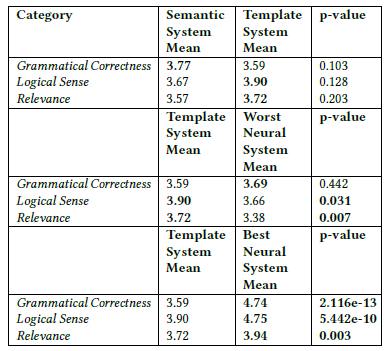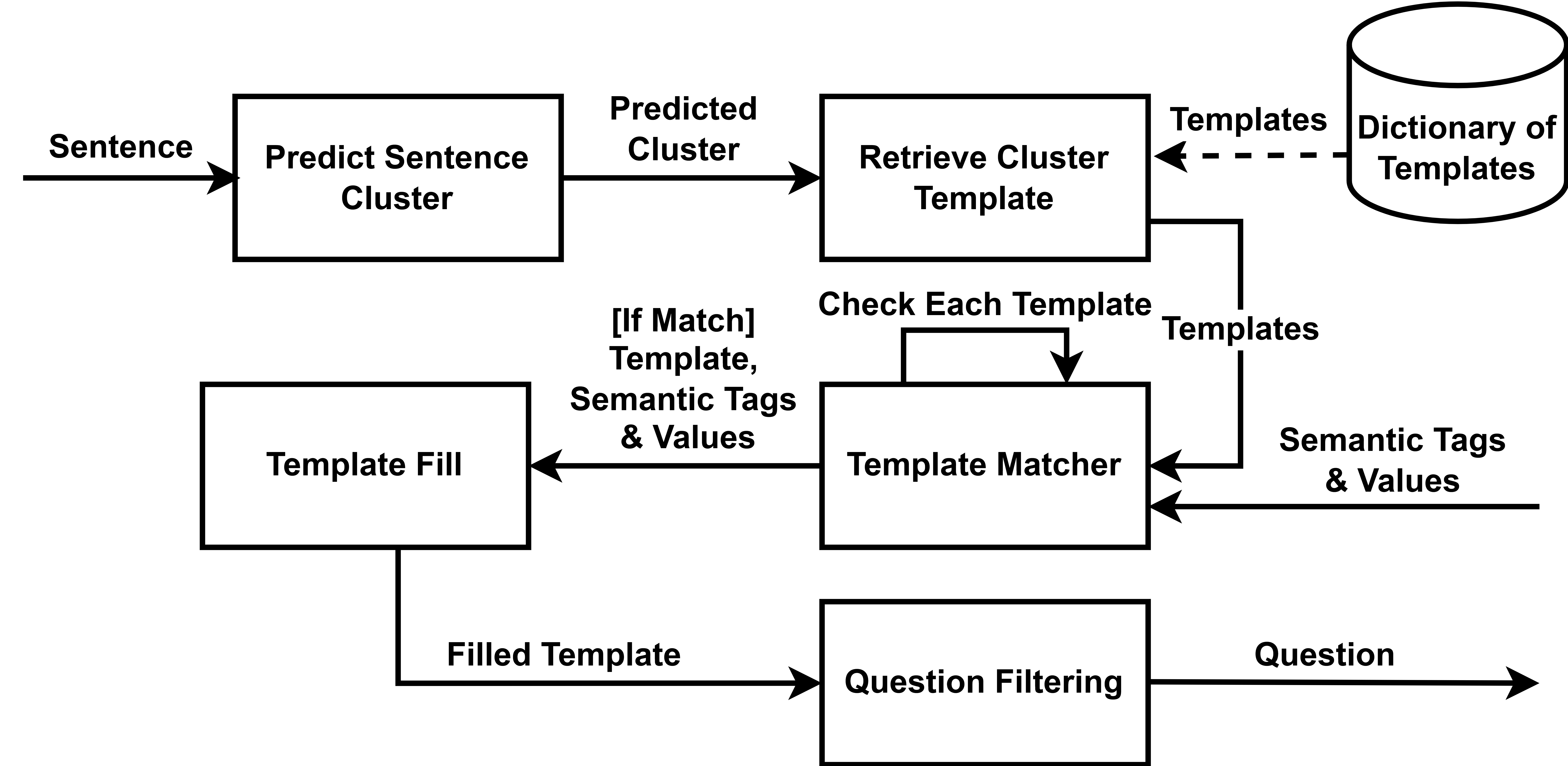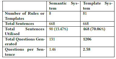 The template-based system was able to match the performance of the semantic system indicating the potential stength of the template-extraction module in matching manually created rules/templates. This indicates that the tedious process traditionally associated with creating templates could be alleviated through automatic systems. In addition, the automatic template-based system achieved much greater coverage over the dataset than the semantic system. The template-based system also matched the performance of the worst peforming neural system but was noticably surpassed by a neural system trained on a larger corpus. These results highlight the continued potential for template-based systems to match more modern neural systems. Further improvements to the template-filling module, by introducing superior linking techniques between templates, and sentences and not just k-means clustering, would likely enhance the performance futher. In addition, the incorporation of a question filtering system using automatic metrics could lead to improved average quality of the output questions.