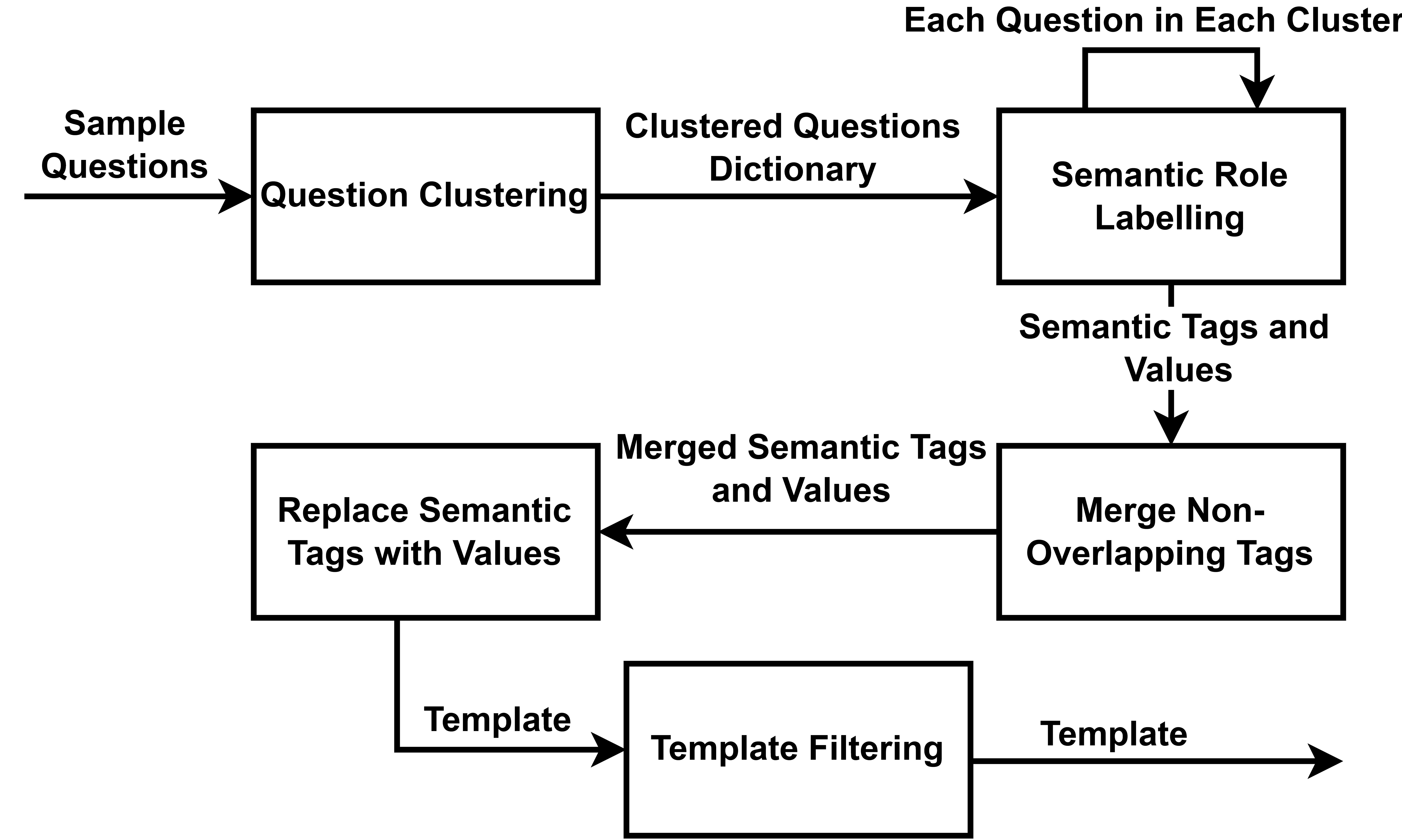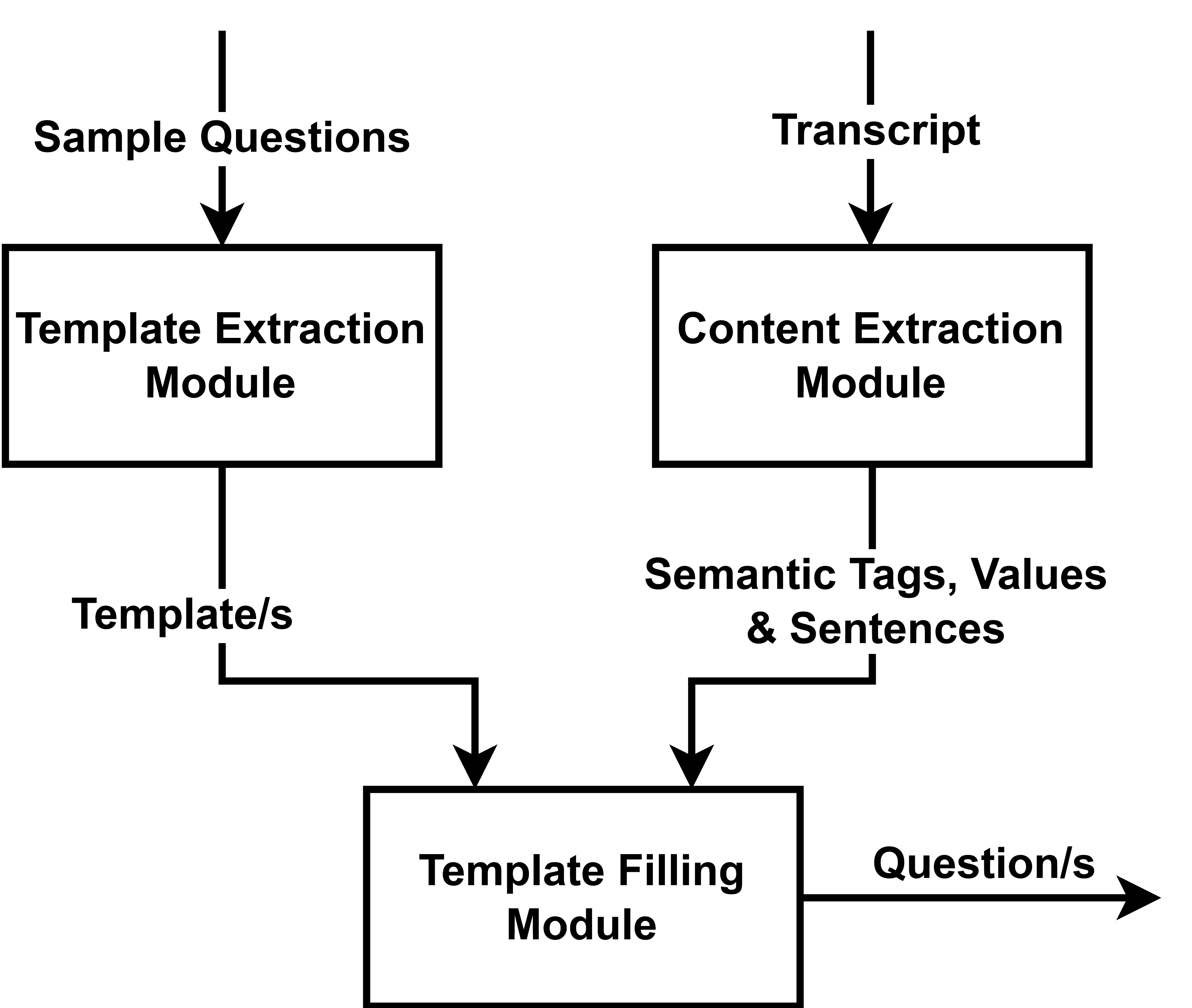 The Template-Based System is split into 3 modules which combine to produce questions. These modules are the Template Extraction, Content Extraction and Template Filling modules.